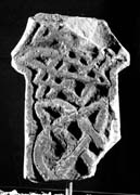 C (broad): This is rather worn, but the evidence suggests that Collingwood (1915a, 247, fig. l) was correct in his reconstruction of the pattern in the shaft as two and a half registers of closed-circuit pattern B. The head has a larger scale interlace, terminating in pointed loops in the lower corners, which possibly develops from the centre strands of the shaft pattern.