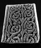 A: There is a double rolled edge moulding on the left, but only part of the narrower inner moulding on the right as it meets the missing face B. The area between is filled with a stylised median-incised bush-scroll, in which the 'volutes' are formed from an almost independent interlacing strand on either side (possibly developing from a point on the stem below the break), and is further complicated because it laces around budding twigs which fork in pairs directly from the central stem. The buds are pointed and lobed. The interlacing strand on the left is complicated by bifurcating at intervals, the strand on the right is simpler. There are ridged nodes on the interlacing strand even at points when they do not bifurcate.