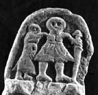 C (broad): There is a round moulding surrounding the head panel, which contains a second frontal figure, again with a short, wide skirt, holding a battle-axe, blade down, in his right hand, and a sword (again with pommel grip and guard) in his left. The pommel is rather differently shaped to that on face A. Below this the surface has been hacked away.