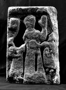 On his right a smaller figure faces centre. He too wears a long robe below which his feet are quite clear. His head is damaged but appears to have been thrown back, as if looking upward. The area of damage extends up into the area above, in which is a square object with rounded corners, now indecipherable. His right arm is raised in front of his body, and he clearly grasps a scroll in his hand; his left arm reaches out to touch the side of the central figure.