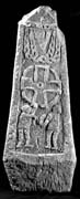 A (broad): There are no panel dividers within the face, which is nevertheless divided into zones of decoration. (i) The top is broken but the damaged sides have left a plain triangular area with a circular boss at its apex. There is no clear indication of a cross-head, but it is possible that this is the lower terminal of a 'spine-and-boss' cross motif filling the head, as on Aberford 2. The plain area is bordered by a simple narrow twist, an arc of a circle, very worn, which implies a cross-head with curved (type E) arm ends. (ii) Below is an enigmatic decoration consisting of a downward-pointing triangular but damaged element, which may only be part of the background incompletely dressed back. On either side, two rope-like simple twists descend from the framing twist above: these curve inwards and interlink below the triangular element, as if forming a frame. (iii) Below is a narrow plain area, separating this decoration from a cross of type B6, its arms joined by a ring and with a raised ring at its centre. Two figures below this cross face towards each other and look up at the cross. The figure on the left raises his right arm to the cross, his left arm is raised in front of his body. The figure on the right (who may be intended to be seen from the back) raises his inner arm also. The figures appear to be abraded and would have seemed more deeply cut originally, but they are very simply carved, with little detail and with simple round heads. Both figures are wearing some form of short dress. The area between the figures is slightly damaged, but there does not seem to be anything between them.