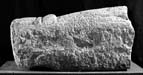 This hogback appears to have been undecorated except for its muzzled end-beast. The ridge is not distinguished and the top and sides are scabbled but otherwise completely plain. The only evident details are the division between the bear's ears, visible on faces D and E, which are plain flat lappets with rounded corners, and the raised band of the muzzle.