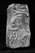 A (broad): Part of a flat border survives on the lower left, but the edge is hacked away above this and the whole of the right side edge is missing. This face has a tangled irregular interlace, rather loose with a large area of background space. Part of the pattern at the mid right has been hacked away. Collingwood interpreted one of the curved strands above as part of the edge moulding for a wheel-head. It is possible that it is the curved edge of the lower arm of the head, otherwise the form of that head cannot be determined. Above this concave curve are further elements of a loose interlace.