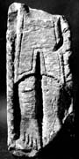 C (broad): This also has an inner flat moulding. The whole face is taken up by a large figure facing right, with legs bent at the hip as though seated. Its head is missing. It holds in its right hand a stick figure with featureless round head, long thin body, and thin legs, which could be seated on the knee of the larger figure.
