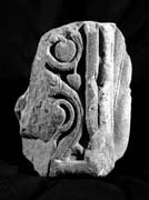 D (narrow): This face had a wider inner moulding but it terminates at the same point as the panel on face A. The side moulding is rolled, the lower border is flat. Within the panel is a deeply modelled plant-scroll, its stem standing directly on the lower edge of the panel. It is a simple scroll with a median-incised stem. The stem divides into alternate-facing volutes at a ridged node. The lower volute terminates in a plain, perhaps round, leaf, like the upper volute, and there is a small pendant berry bunch or round leaf in the spandrel.