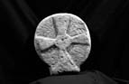 A (broad): The round, plate-like head is dressed back smoothly around a raised cross of type E6. The crossing of the arms is overlain by a flattened roundel with a compass mark at its centre.