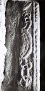B (narrow): The fragmentary remains of two panels survive along with the left-hand cable-moulding border. Both panels had inner frames, the upper one rectangular, the lower arched. (i) In the upper frame are fragments of a central-stemmed (bush or tree) scroll with two curving side shoots. (ii) Below is a panel of knotwork which Collingwood (1927a, fig. 92 g) plausibly restored as two parallel runs of half pattern A.