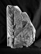 The fragment consists of parts of two adjacent sides of a shaft separated by a bold decorated roll moulding; a narrow vertical moulding border flanks each face. The prominent moulding is ornamented with a series of three stiff foliate stems, each group set one above the other, which spring at an angle from the right side of the composition. These triple stems are bound together by three mouldings. The outer leaves curl away from the central stem.