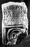 B (narrow): Only the horizontal roll moulding to separate head and shaft remains from the framing of this face. (i) In the head is an inscription in Latin capitals which is described below. (ii) Below, on the shaft, is one spiral of a scroll with no evidence of fruit or foliate elements.