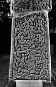 A (broad, west): The single panel contains disordered spiral-scroll and knotwork, the latter incorporating four loose rings set around right-angled crossings. In the centre of the lower section is a four-legged animal, standing vertically with legs to the right; his head, at the bottom of the panel, has a round eye and gaping jaws which extend to form interlace strands.
