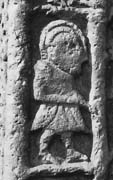 Stone 2bD is badly worn at the top but below are four balanced panels, the two uppermost virtually complete and the other two incomplete. In the upper left panel, below the arch, is a figure whose forward-facing head is part-inclined inwards. The body, clad in a short garment, is seen in profile and his head is haloed. The legs face right and the feet are arched. One arm is bent across the body, holding a thin rod across his right shoulder. In the facing panel is a mirror-image figure also carrying a staff; here the left arm is more clearly bent across the body, grasping a staff which rests on the man's left shoulder.