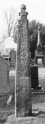 C (broad, west): This face is heavily weathered but, in favourable light, it is possible to see that the various panels were framed by a continuous lateral frame set within the arris moulding. There seem to be five panels. Only vague relief decoration can now be seen in panel (i), but immediately below in panel (ii) is a standing human figure, facing forward with legs apart, his head surrounded by a large halo. His arms appear to be raised. In some lights he seems to be holding a spear in his right hand. (iii) The panel below seems to contain an antlered long-necked beast facing right. The two front feet are clear but to the rear the animal seems to dissolve into a curling terminal. (iv) The next panel (there may be two panels here) no longer carries any recognisable ornament, but the longer panel (v) below seems to carry knotwork in two parallel vertical strips.