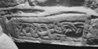 The fragment is now set horizontally with a rounded and undecorated end (?originally the base) to the east. The decoration is flanked by broad flat borders and consists of median-incised knotwork whose organisation is muddled in the central section. To the right is a three-strand plait; to the left a more irregular form of knotwork with loose end and non-continued strand.