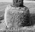 This roughly-squared stone narrows from top to bottom on all faces. The top of the stone has been worked so as to leave a flat area surrounding a raised moulding which immediately surrounds the socket; this carries a (now worn) run of dogtooth ornament carved in relief.