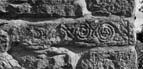 The border-moulding for the bottom of the shaft survives to the right whilst one lateral border remains fragmentarily. These borders contain four volutes of a very worn single-stemmed spiral scroll. The two volutes at the base of the shaft (to the right in its present horizontal position) terminate in a fruit rosette. The second volute from the base drops a pointed leaf, with pellets at its base to the right.