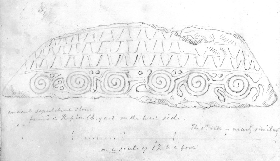 Repton 18A (BL Add. MS 9463, fol. 54, drawing by Samuel Lysons c. 1815 - nts). This more finished drawing of face A also includes a scale and the evidence for discovery. Plate: 348.