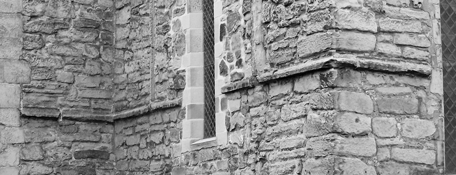 Repton 23a, b External view looking NW at the SE angle of the chancel showing the string course at 51.30 OD with E and W pilaster strips, continuing along the E face of the SE angle of the central space (nts) Plate: 387.