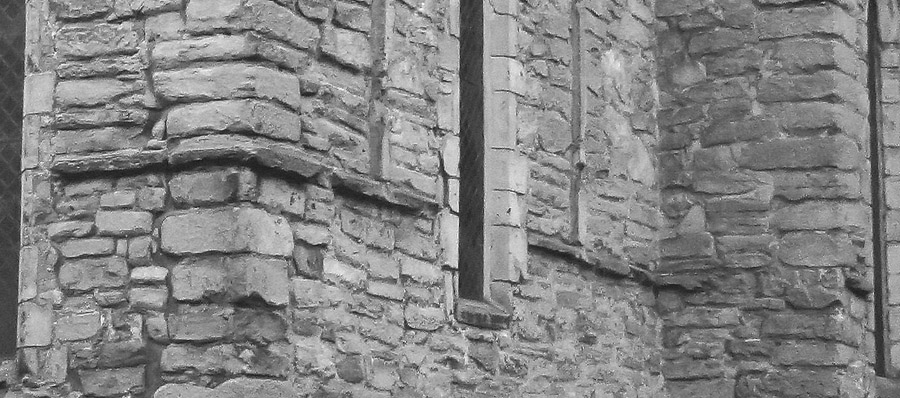 Repton 23a, b External view looking SW at the NE angle of the chancel showing the string course at 51.30 OD and pilaster strips (nts) Plate: 389.