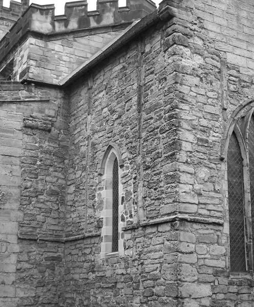 Repton 22-23 External view looking NW at the SE angles of the central space and chancel showing the string course (22a) at 51.30 OD, and pilaster strips on the E face of the central space and on the S and E faces of the chancel (nts) Plate: 379.