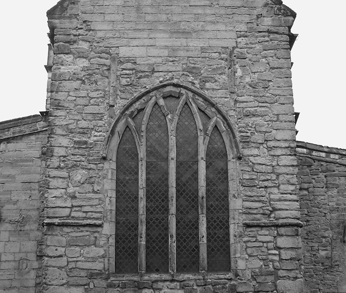 Repton 22-23 External view looking W at the E face of the chancel showing the string course at 51.30 OD and pilaster strips, and the upper springers (22c) of the chancel at 57.00 OD at the SE and NE corners (nts) Plate: 380.