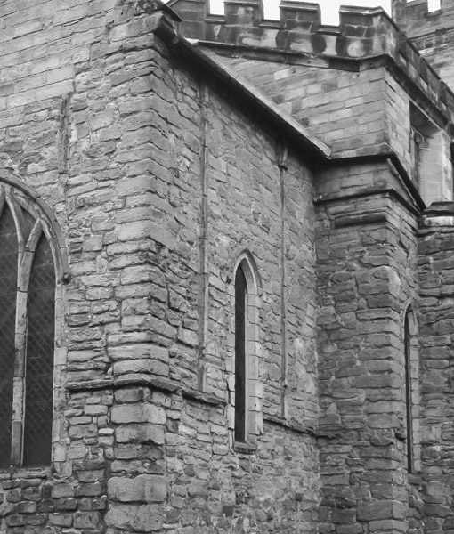 Repton 22-3 External view looking SW at the NE angles of the central space and chancel showing the string course (22a) at 51.30 OD, pilaster strips and capitals on the N and E faces of the chancel, and the lower springer (22b) at 55.30 OD on the E face of the central space (nts) Plate: 381.