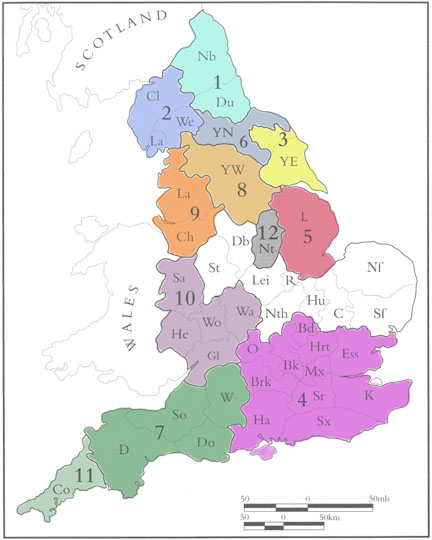 The numbers on the map refer to the regions covered in the volumes, as follows:
